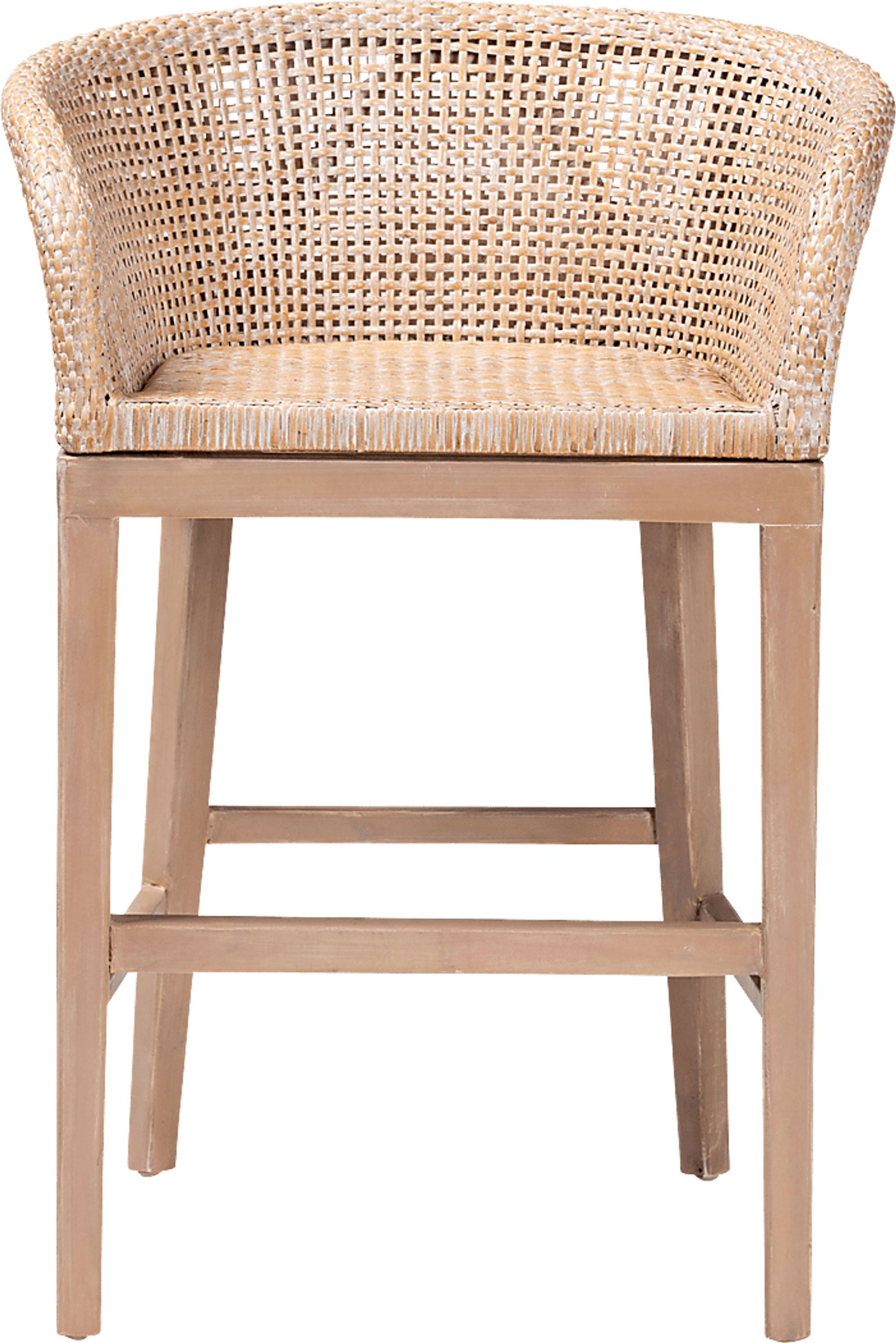 Enchant the mood of every occasion with the rustic charisma of the Dollard brown counter stool. This bohemian piece consists of a sturdy mahogany wood frame adorned with woven natural rattan. Its rounded backrest curves around the frame to form sloping armrests while creating a beautiful display. The Dollard features a convenient footrest to encourage relaxation. Channeling the allure of exotic craftsmanship, the Dollard uplifts any arrangement. Rattan is a product of nature and may have variations in areas such as, but not limited to, color, pattern, grain and texture. The hair-like strands of rattan/rattan-fiber are common due to the nature of the material.