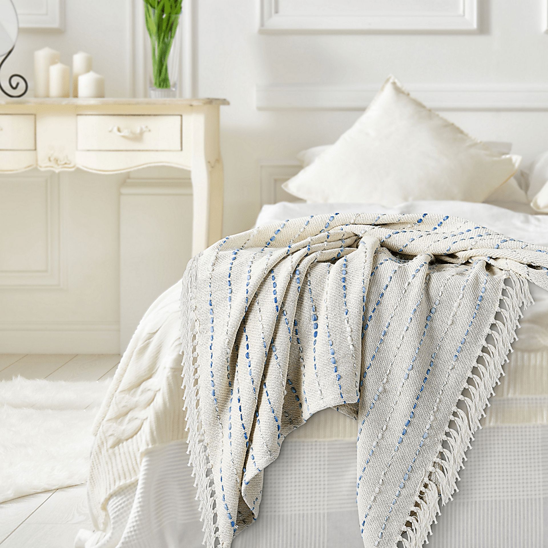 Add a cozy and stylish touch to your home with this handwoven throw blanket. Made in India using a blend of 90% cotton and 10% polyester, this blanket is both soft and durable. The embroidered striped design and fringe accents add a touch of elegance and texture to the piece. Whether you use it as a decorative accent or to snuggle up with on a chilly evening, this throw blanket is sure to become a favorite in your home.